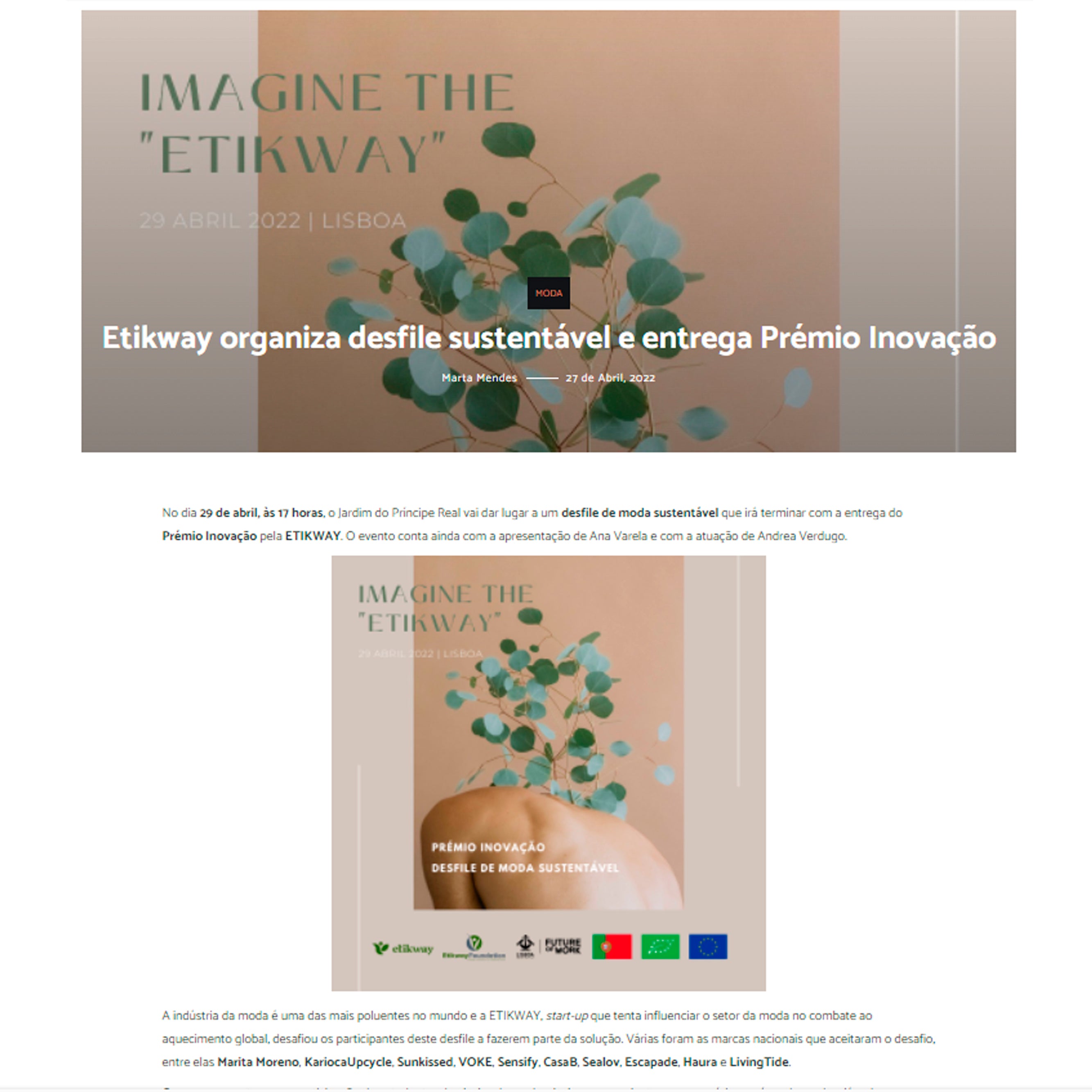 "A ETIKWAY, startup, incubadora de designers de moda e beleza sustentáveis, premiou 11 marcas nacionais e internacionais que se distinguem pelo seu caráter de sustentabilidade. Estiveram a concurso para o prémio de inovação 22 marcas e designers, que se dividiram em cinco categorias: calçado, sportswear, pronto-a-vestir, casamento e roupa de festa e vestuário criança. A entrega de prémios decorreu no passado dia 29 de abril, no Jardim do Príncipe Real, em Lisboa.