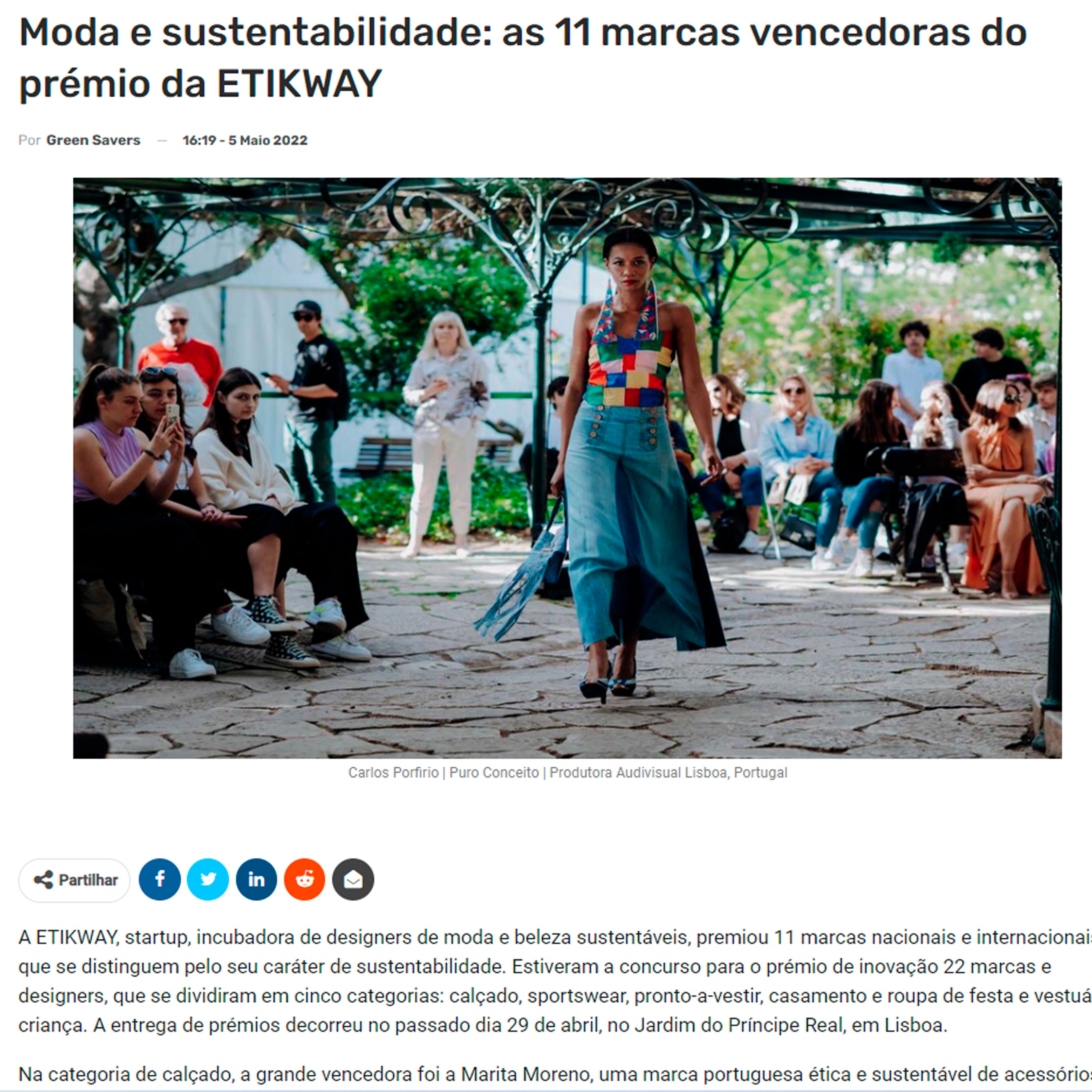 Na categoria de calçado, a grande vencedora foi a Marita Moreno, uma marca portuguesa ética e sustentável de acessórios de moda. Apresentou no concurso dois pares de sapatilhas e botas desportivas, 100% veganas e feitas a partir de alfarroba."
