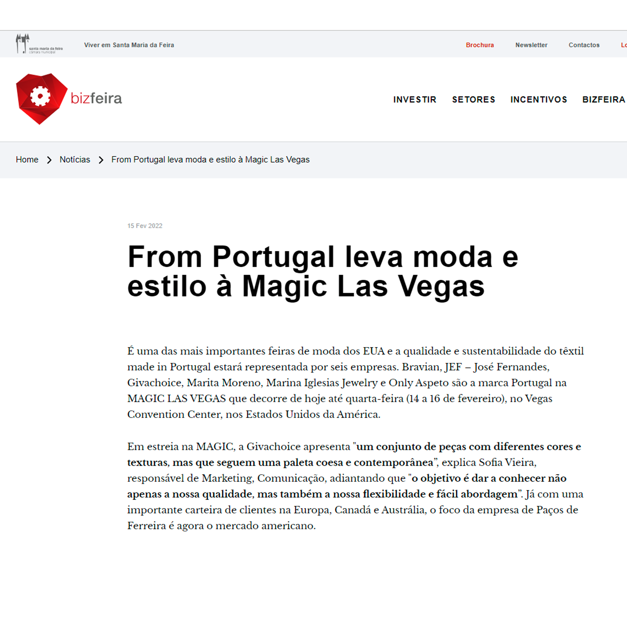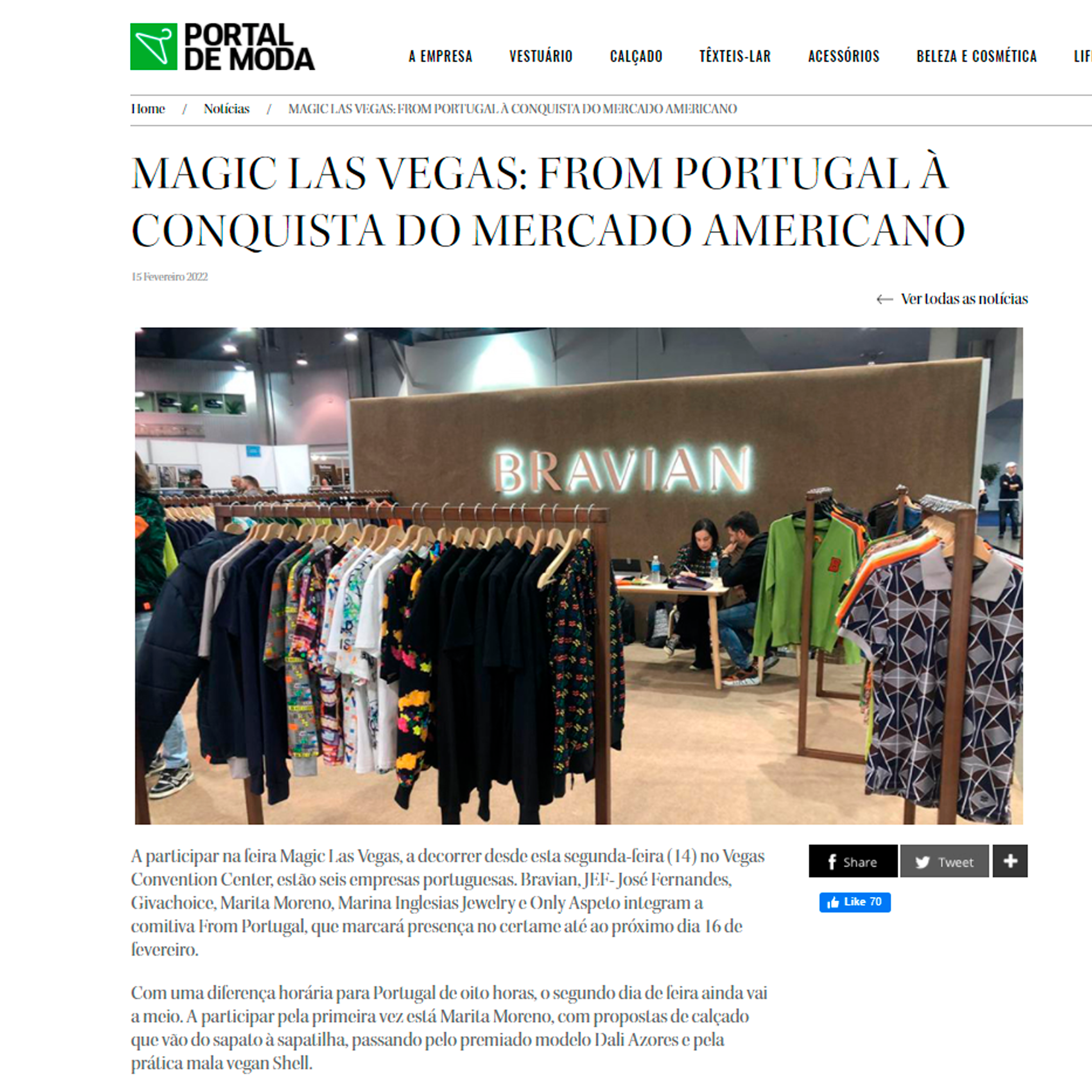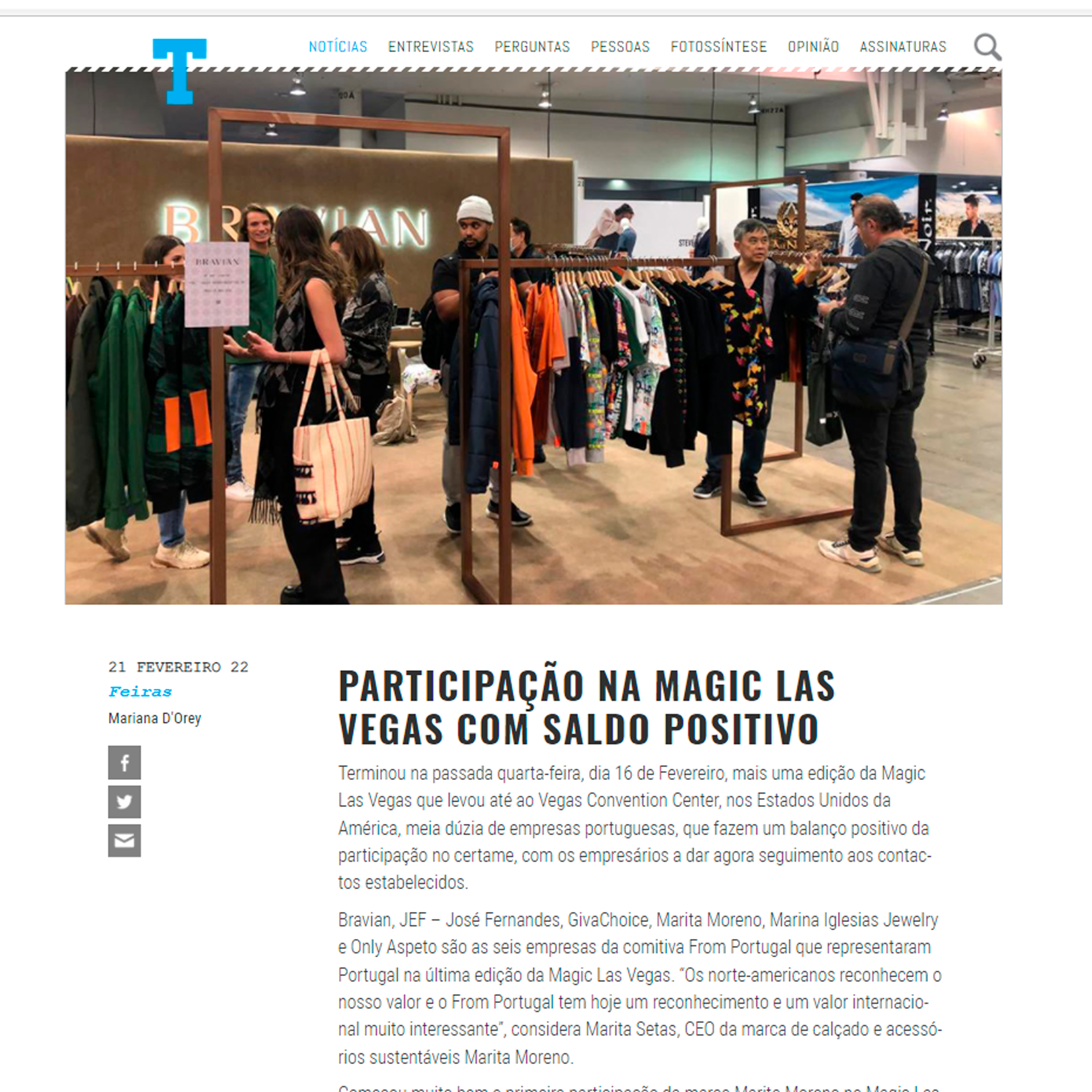 Bravian, JEF – José Fernandes, GivaChoice, Marita Moreno, Marina Iglesias Jewelry e Only Aspeto são as seis empresas da comitiva From Portugal que representaram Portugal na última edição da Magic Las Vegas. “Os norte-americanos reconhecem o nosso valor e o From Portugal tem hoje um reconhecimento e um valor internacional muito interessante”, considera Marita Setas, CEO da marca de calçado e acessórios sustentáveis Marita Moreno."See more in https://jornal-t.pt/noticia/participacao-na-magic-las-vegas-com-saldo-positivo/