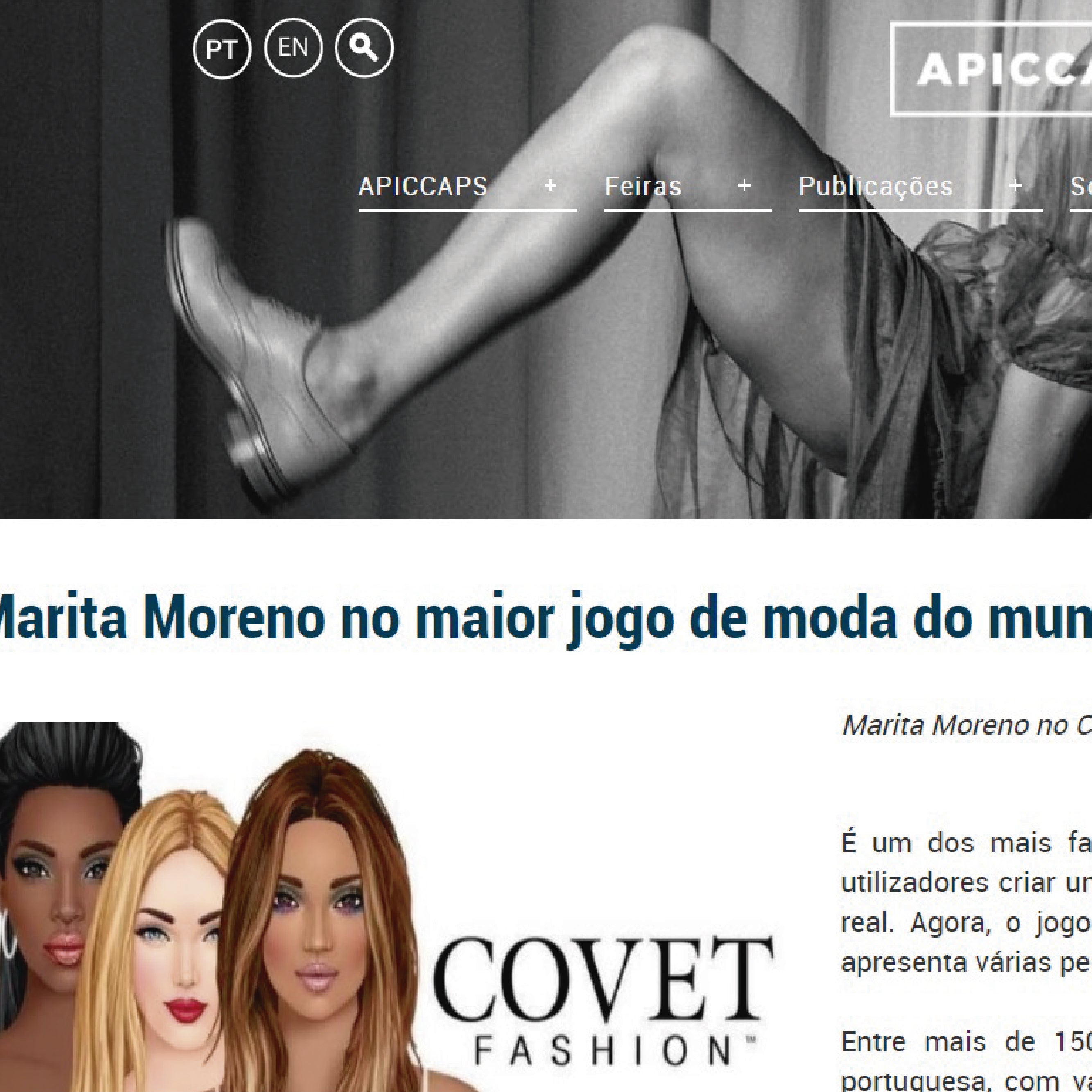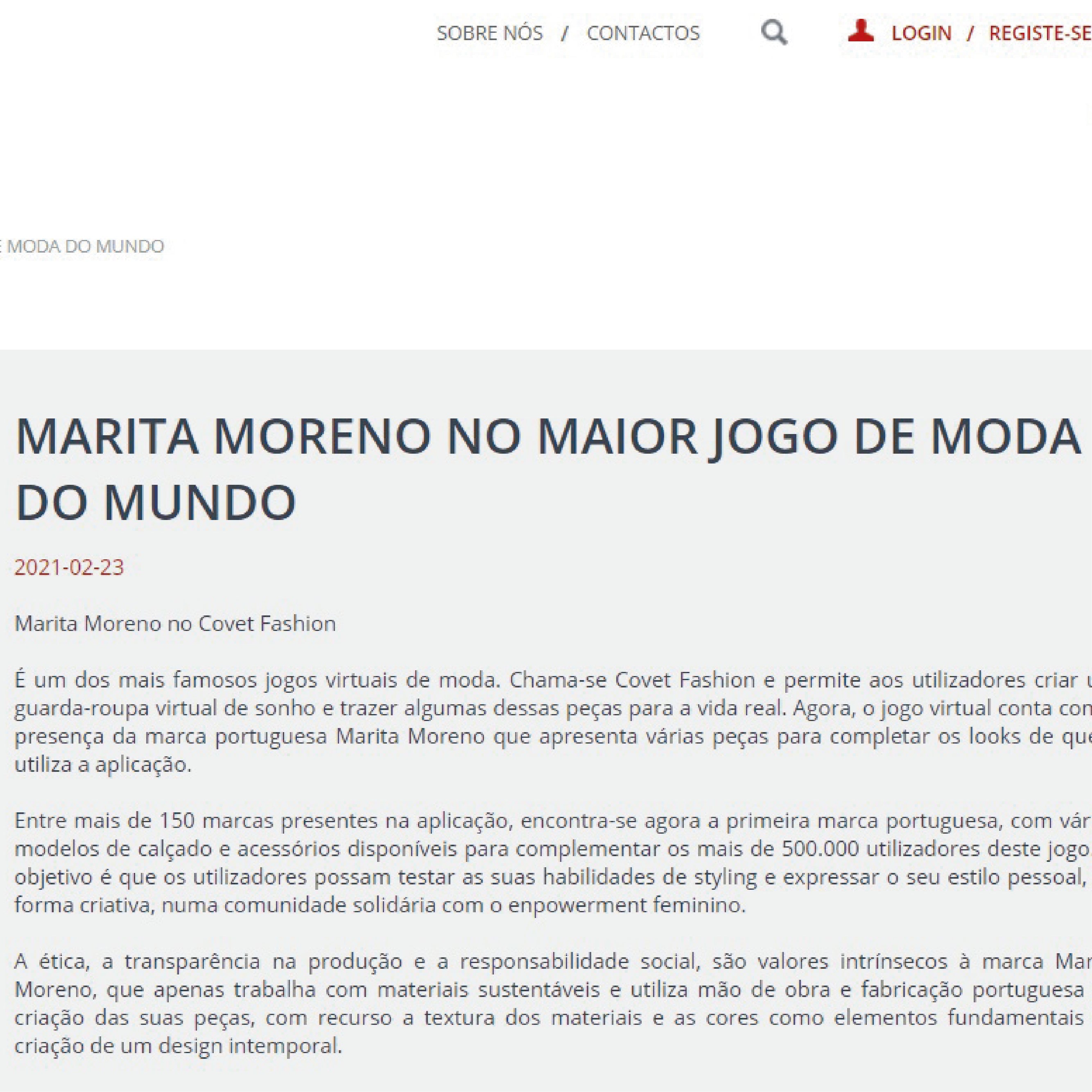 "É um dos mais famosos jogos virtuais de moda. Chama-se Covet Fashion e permite aos utilizadores criar um guarda-roupa virtual de sonho e trazer algumas dessas peças para a vida real. Agora, o jogo virtual conta com a presença da marca portuguesa Marita Moreno que apresenta várias peças para completar os looks de quem utiliza a aplicação.Entre mais de 150 marcas presentes na aplicação, encontra-se agora a primeira marca portuguesa, com vários modelos de calçado e acessórios disponíveis para complementar os mais de 500.000 utilizadores deste jogo. O objetivo é que os utilizadores possam testar as suas habilidades de styling e expressar o seu estilo pessoal, de forma criativa, numa comunidade solidária com o empowerment feminino." -