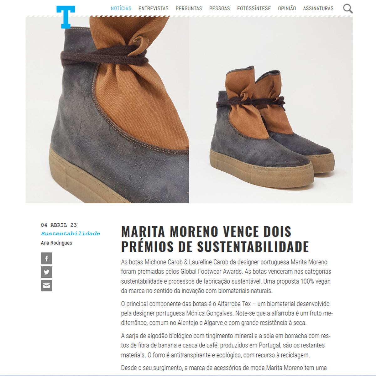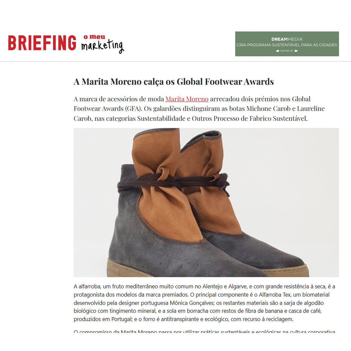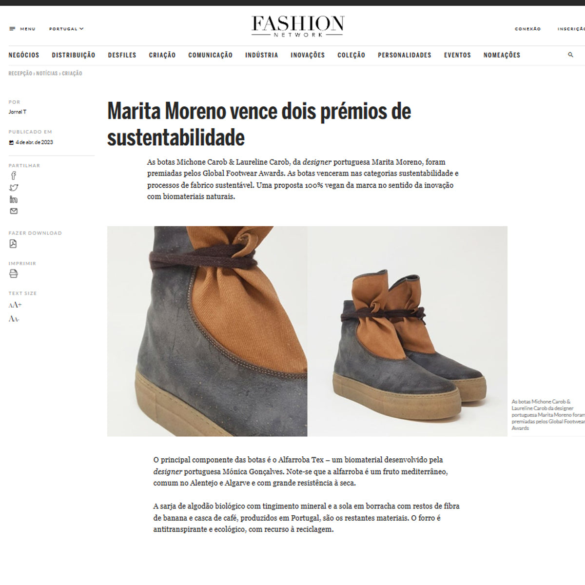 "As botas Michone Carob & Laureline Carob da designer portuguesa Marita Moreno foram premiadas pelos Global Footwear Awards. As botas venceram nas categorias sustentabilidade e processos de fabricação sustentável. Uma proposta 100% vegan da marca no sentido da inovação com biomateriais naturais.