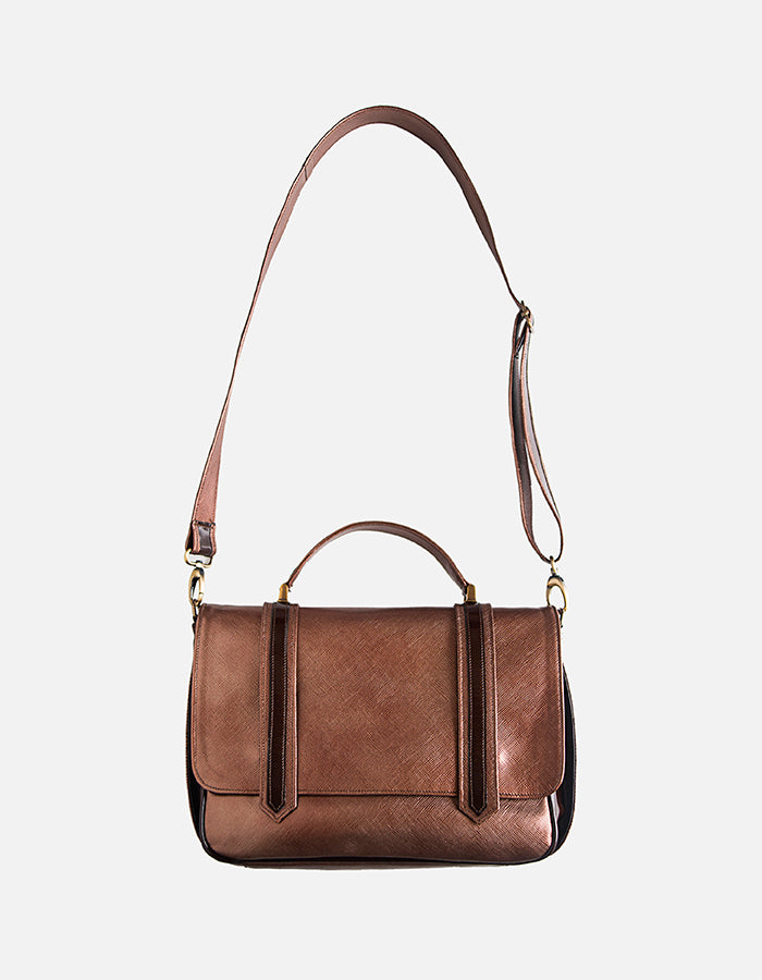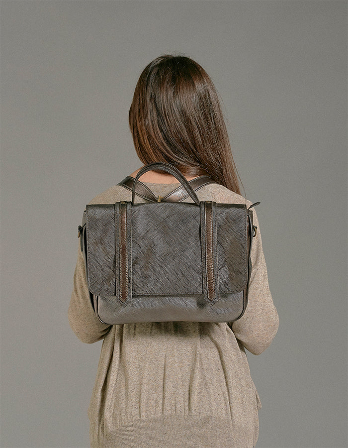 Dali Derby é uma pasta/mochila em couro texturado e verniz upcycling de coleções anteriores. É extremamente prática, com uma bolsa externa, uma bolsa com fecho interno, espaço para computador de 11 '', uma pega superior e tem o tamanho perfeito para uma bolsa de trabalho. É uma pasta clássica que pode ser usada de 4 maneiras: