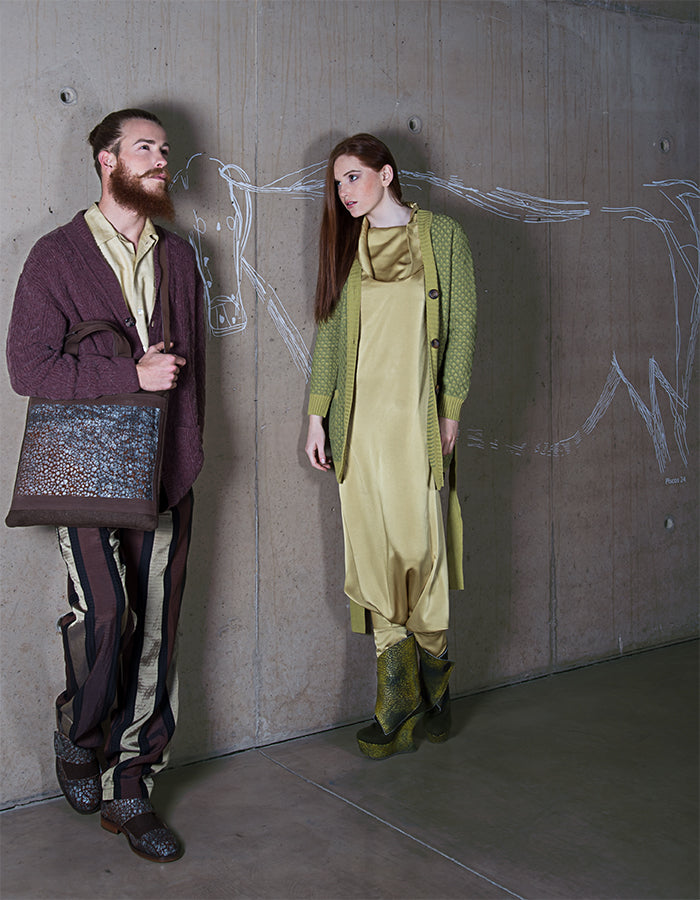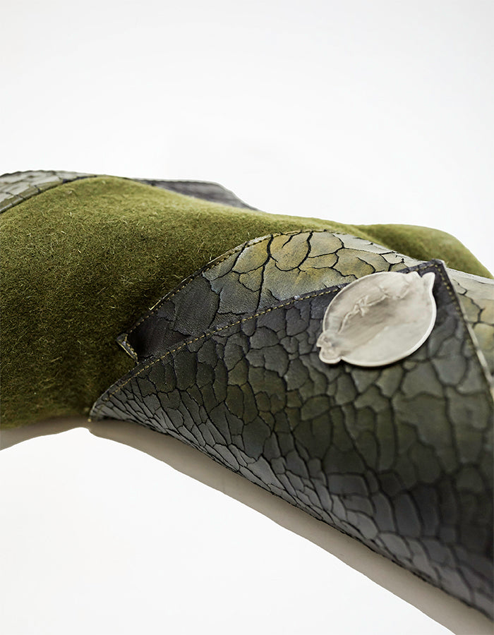 O couro cracklet verde pintado à mão é português e feito especialmente para esta coleção.