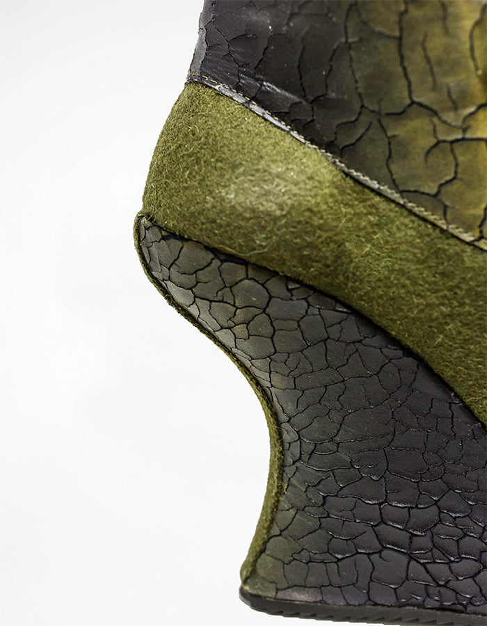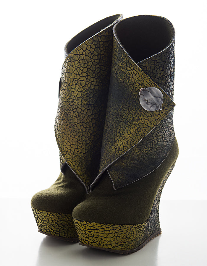 As botas femininas Fariseu são feitas de couro verde cracklet pintado à mão e burel verde ao tom, para criar um contraste nítido de texturas numa forma escultural. FARISEU é o nome da rocha e do desenho pré-histórico representado no botão metálico da bota. Os 2 materiais - couro e burel são combinados de uma forma que o pé encaixa pé na parte macia - burel - da bota e a aba de couroenvolve o tornozelo e a perna sobrepondo-se e apertando com um botão de pressão em que os desenhos pré-históricos gravados são o ponto focal da bota