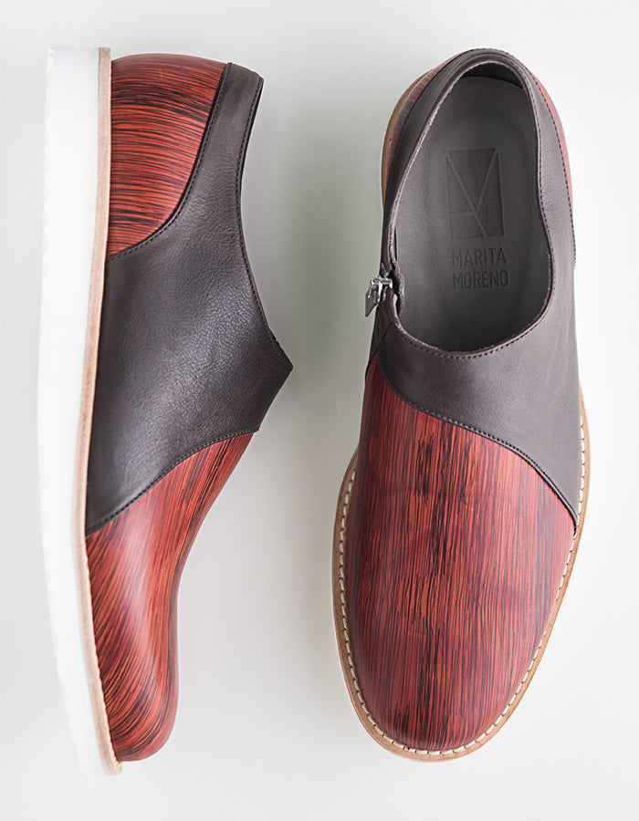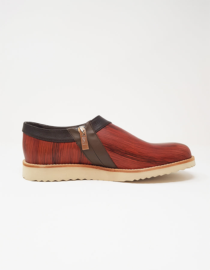 Sapatos Summer Clouds Estratos são inspirados nas nuvens estratos de baixa altitude e aparecem ao amanhecer com cores como laranjas e castanhos. Este modelo tem um alto contraste castanho/laranja como as nuvens, com couro upcycling castanho escuro e com padrão listado laranja com linhas finas contrastantes e irregulares em castanho. Com cortes ergonômicos e bom calçar, sola ultraleve, palmilha super-confortável e com zíper interno. É uma coleção de calçado contemporâneo confortável em couro upcycling, com cortes ondulados, lembrando as diferentes nuvens do verão.