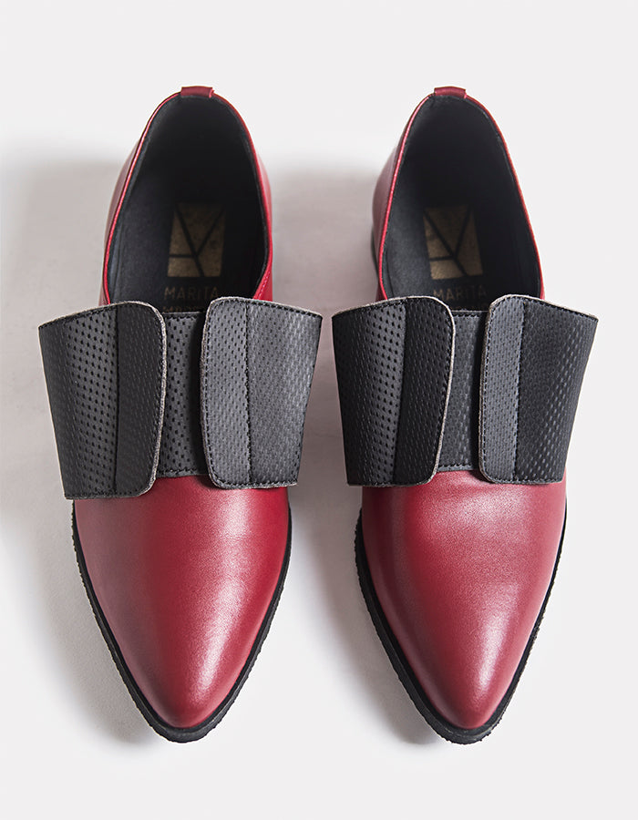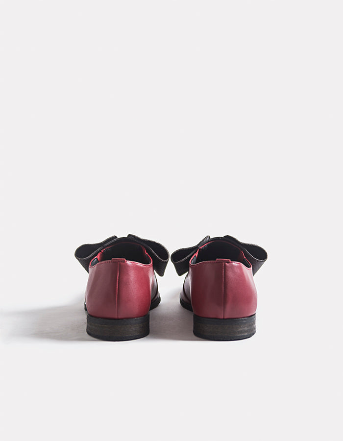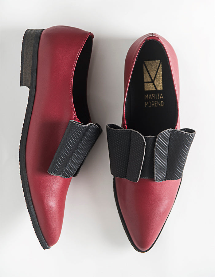 Antoinette é um sapato de senhora de bico fino inspirado na forma dos sapatos e no volume dos laços usados na moda do século XVIII. O Antoinette Vermelho Vegan é um sapato vermelho com um design arrojado - com o laço preto, tem um calçar excelente e um andar muito confortável devido ao elástico que se ajusta ao pé.