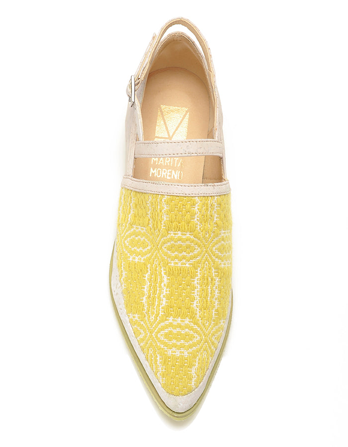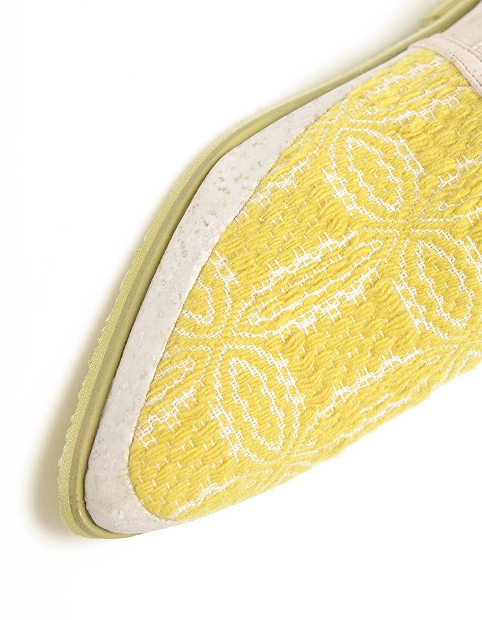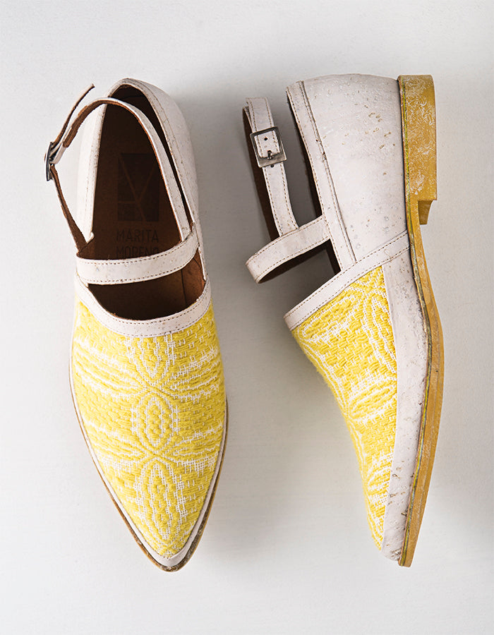 O Azores Furnas é um sapato muito confortável, com um design delicado, em que o tecido artesanal e o design das alças realçam a sua beleza. São produzidos em cortiça branca com tecelagem amarela feita à mão e possuem uma tira e fivela com elástico para se ajustarem confortavelmente ao pé.