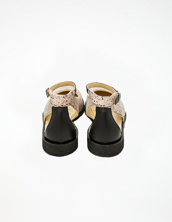Esses sapatos têm um excelente ajuste com o calcanhar acolchoado e um andar muito macio e confortável. A faixa de ajuste ao tornozelo é perfeita para dias felizes a caminhar ou a ficar no conforto do lar. Usamos manchas irregulares multicoloridas pintadas à mão e couro biológico preto - um material verde que não possui metais pesados em sua composição e pode ser enterrado e se dissolver em 2 a 3 semanas, servindo como composto natural.