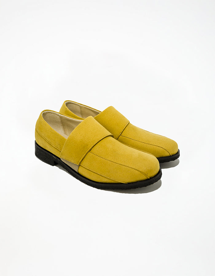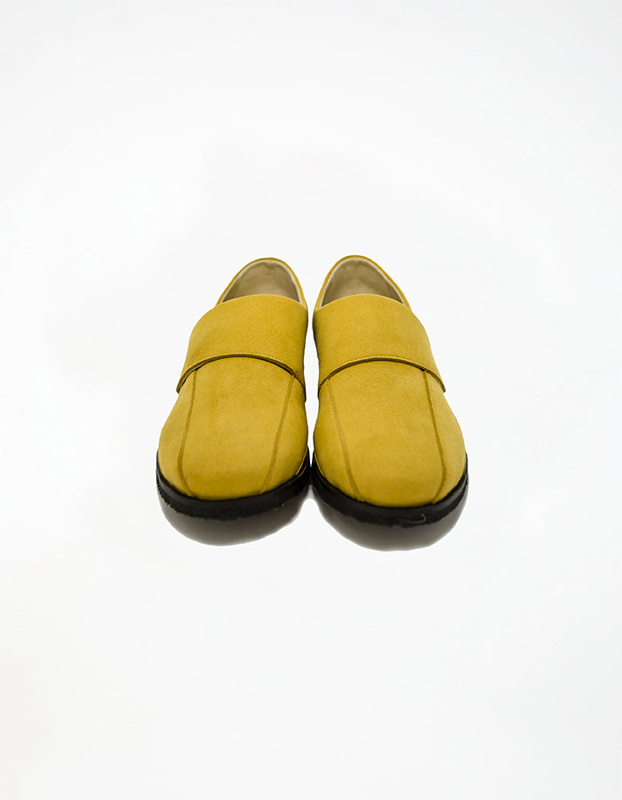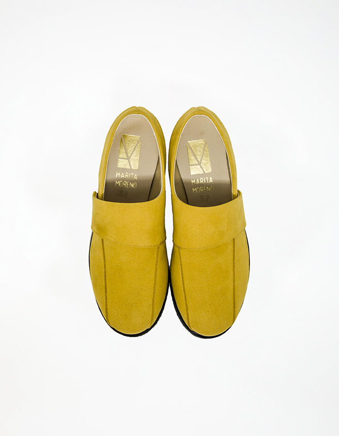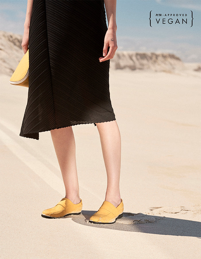 Sand é um sapato de bico redondo de senhora feito em microfibra de camurça mostarda. É um calçado prático e para meia temporada, muito macio e com um caimento excelente e um andar muito confortável. O elástico para se ajustar ao pé é perfeito para dias felizes a caminhar ou a ficar no conforto da sua casa.