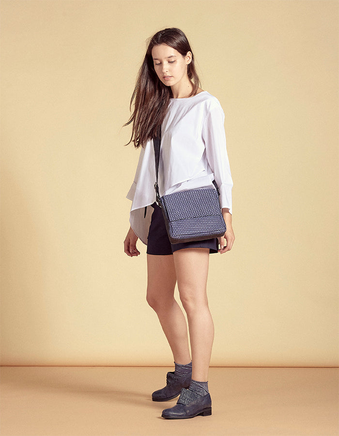 Shadows Flat Azul é um sapato fechado em couro upcycling plissado e liso, com biqueira redonda, salto baixo em aglomerado de madeira e elástico no peito do pé para ajustar, com couro liso e cortes retos, é muito elegante e combina bem com jeans e clássicos. As pregas do plissados são costuradas em direções opostas, criando uma sensação de ondas que cobre o elástico e cria ritmo e ondulação no sapato.