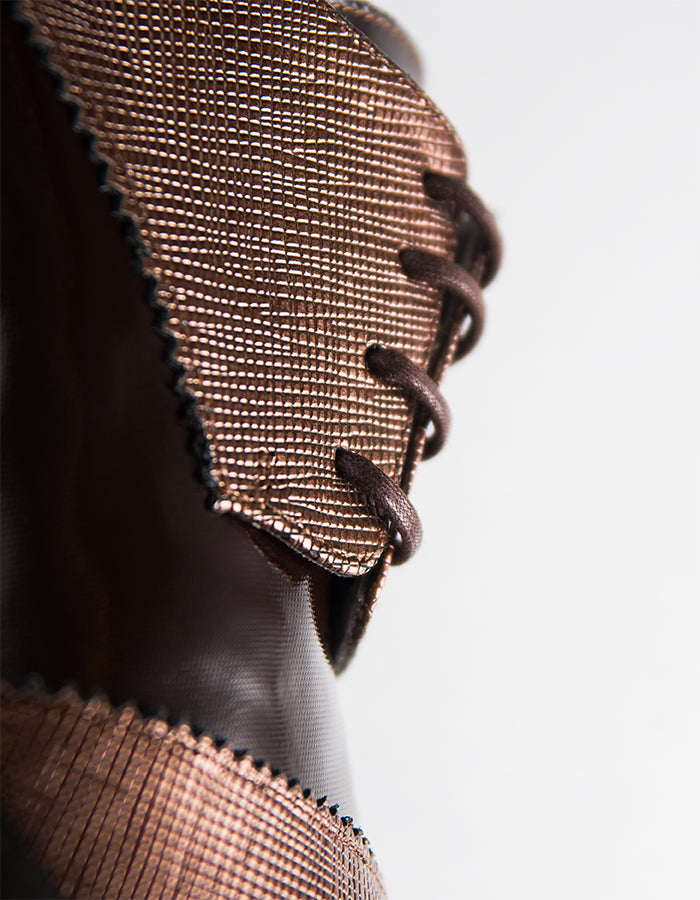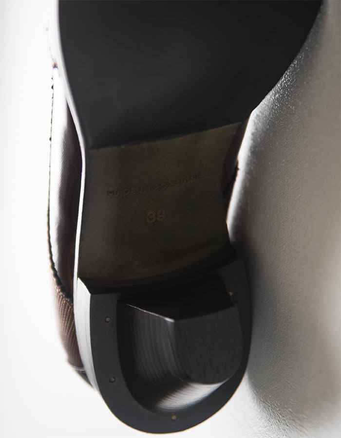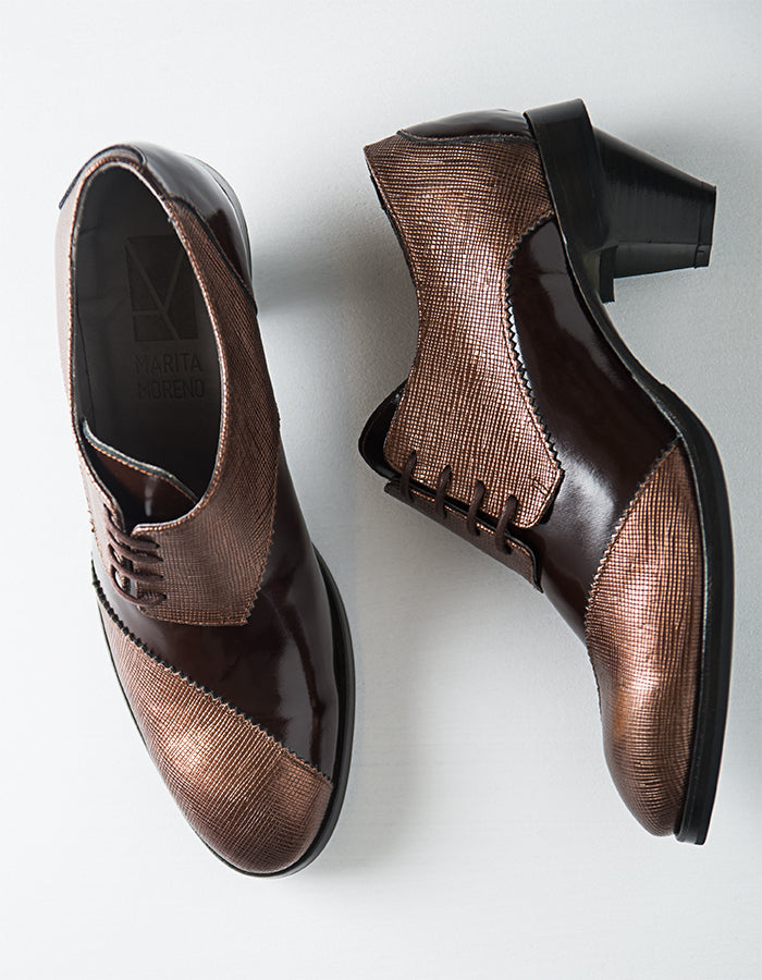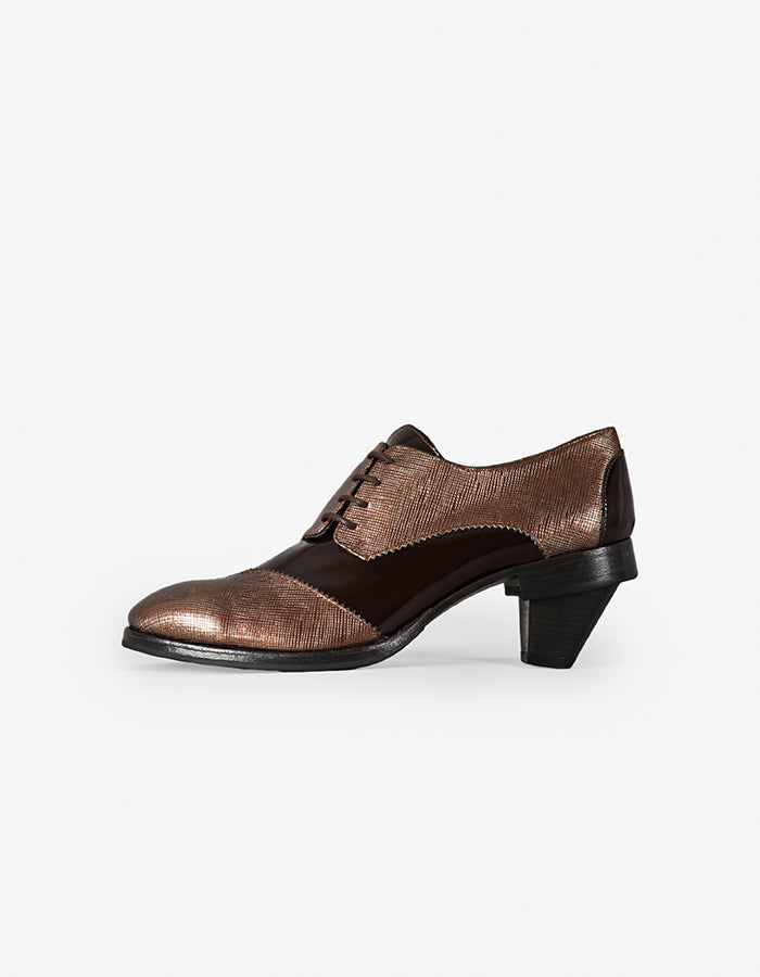 Dali Derby Castanho é um sapato clássico de altura media, atacadores laterais e com um salto surrealista em que dois saltos parecem colados numa peça. Este modelo é o clássico derby com o corte do sapato em três peças – a gáspea, a orelha e a biqueira assimétrica com “picoté”. São feitos em couro upcycling texturado castanho e verniz castanho, atacadores castanhos e sola de couro clássica, salto de aglomerado e borracha antiderrapante. Perfeito para jeans e fatos, têm um andar muito confortável e atacadores laterais cinzas para ajustar o pé.