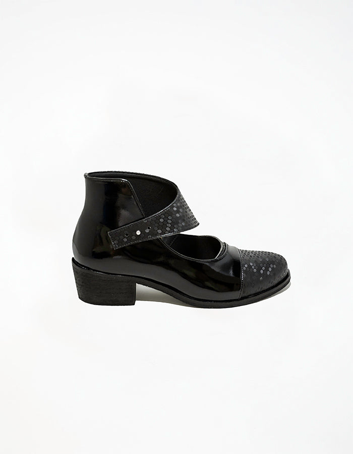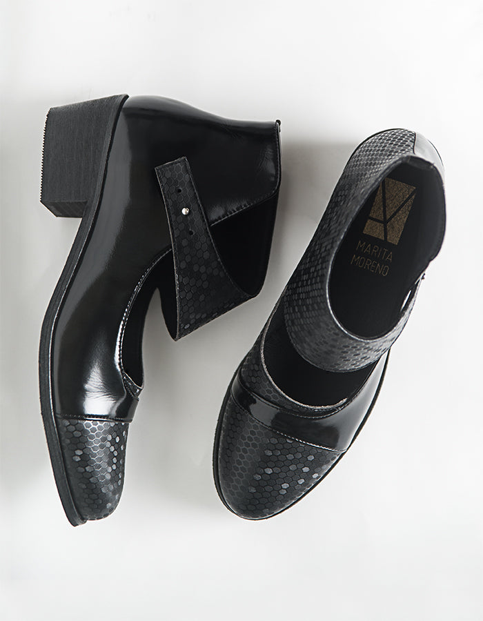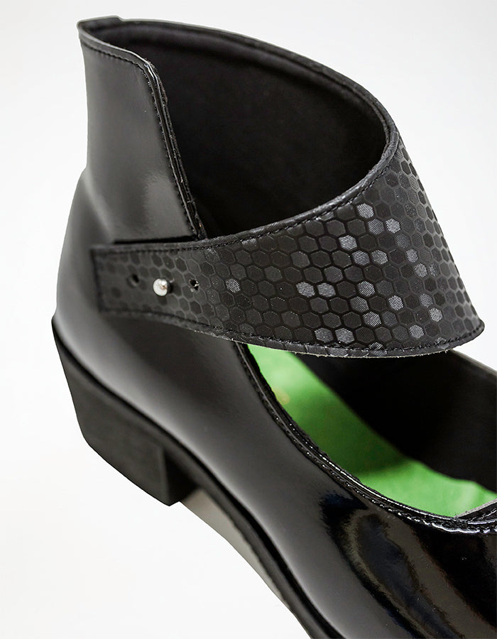 Nestes sapatos, usamos verniz preto e microfibra preta texturizada - um material vegan de alta qualidade, resistente e com uma Certificação ecológica - este material tem práticas ecológicas ao coletar restos dos cortes e produção das marcas clientes para reciclá-los em novos materiais.