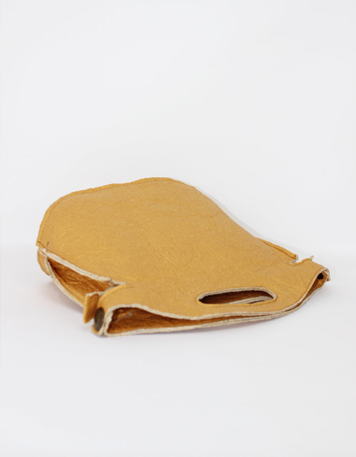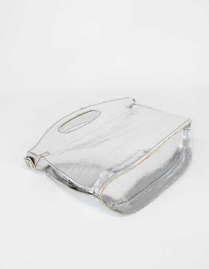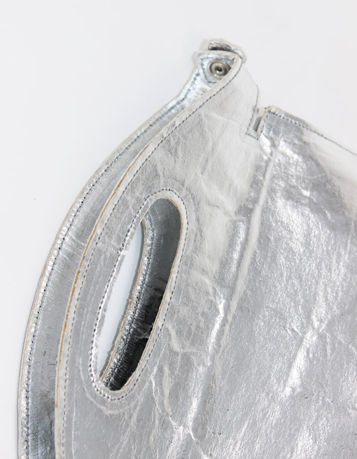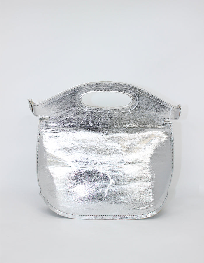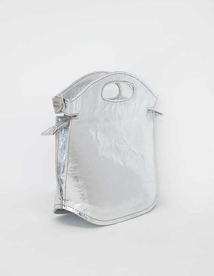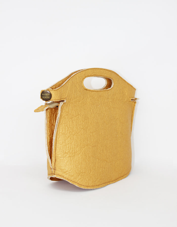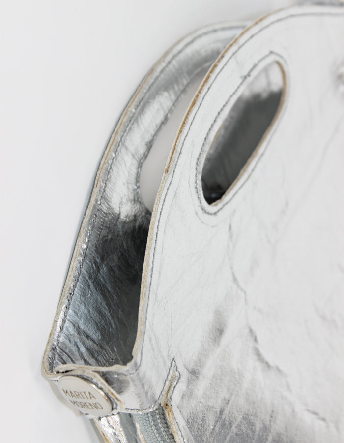 Colette is a romantic mini-bag made of gold mineral or silver pinatex with a beige or grey zip closure.