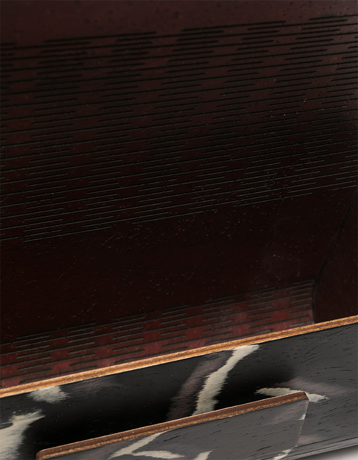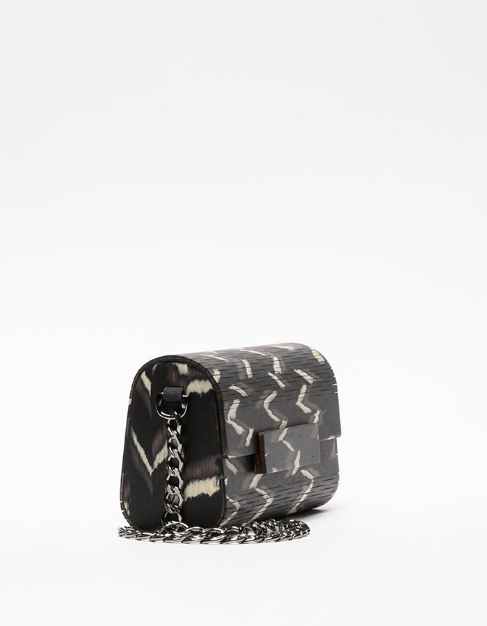 A Bolsa de Madeira DAVIS é em madeira pintada de Olho de Perdiz formando um padrão de plumas preto, rosa pálido e pérola. São desenhadas por nós e feitas por uma família de artesãos certificados pela UPA (Unidade de Produção Artesanal) de Barcelos, Portugal. O pai é carpinteiro e este novo projeto é das 2 filhas e do genro.