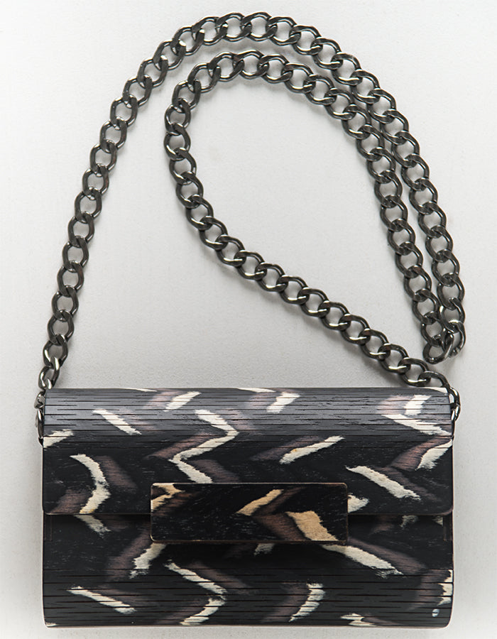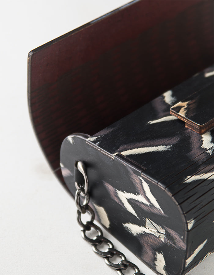 Madeira é o principal material das bolsas e clutchs - são feitas com aglomerado de madeira (restos de madeira moído agregado com cola), cobertas por uma chapa da madeira natural (dando a beleza da madeira natural, mas não usamos madeira pura para não incentivar ao corte das árvores). As bolsas são depois cortadas a laser e são feitos rasgos nas superfícies para dar flexibilidade às curvas; o interior é revestido a cortiça e as alças são de alumínio - um metal muito leve e flexível e sem níquel. O logotipo da marca é gravado numa das laterais.
