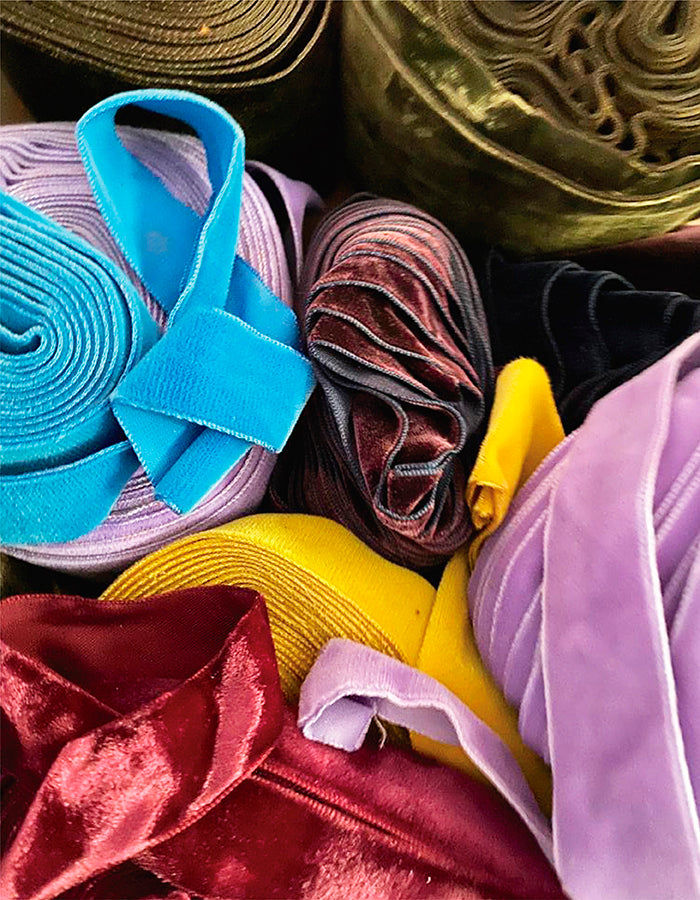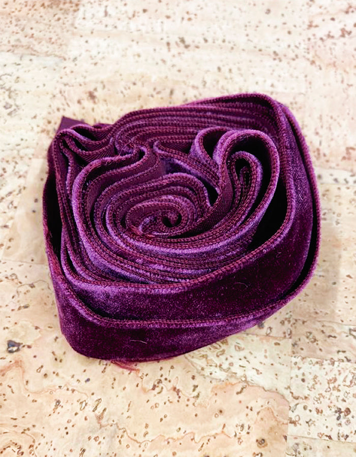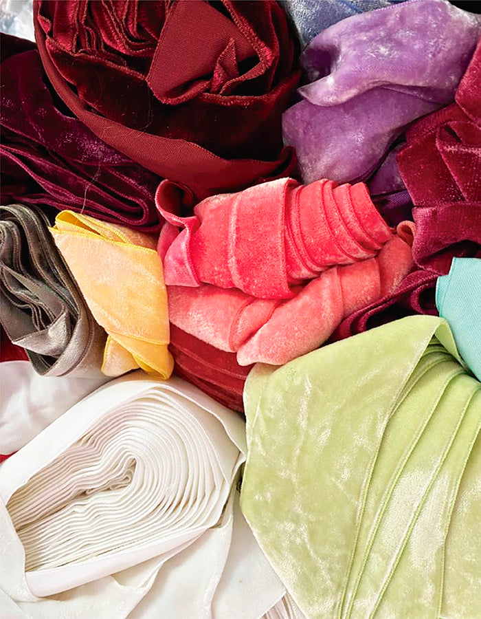 Em fitas de veludo - que são feitas de algodão - temos várias cores disponíveis