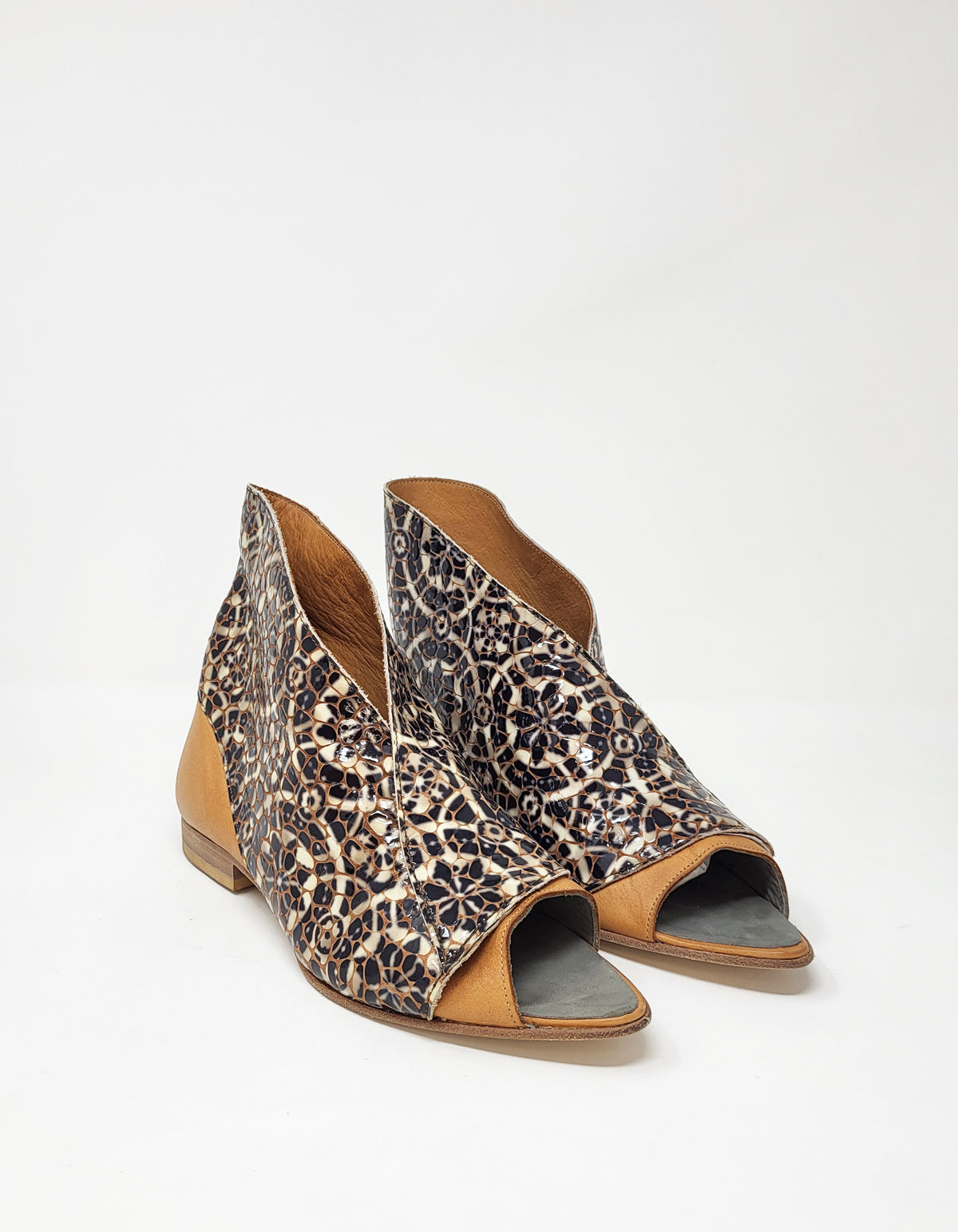 What About Skin West é um sapato de senhora pontudo/ bota abertas, em couro caramelo upcycled e couro upcycled com padrão dos nossos azulejos tradicionais portugueses.