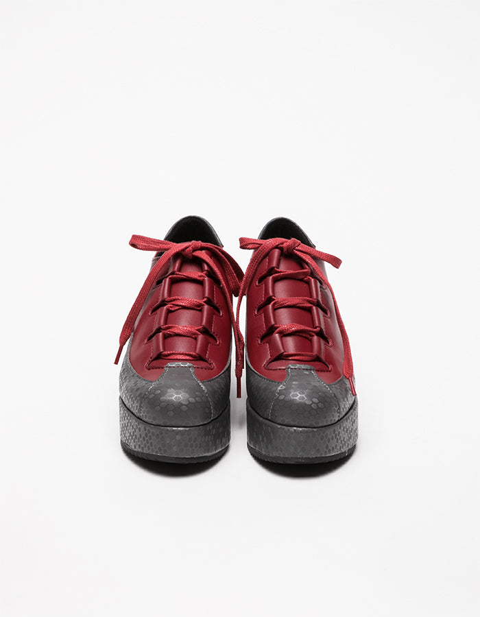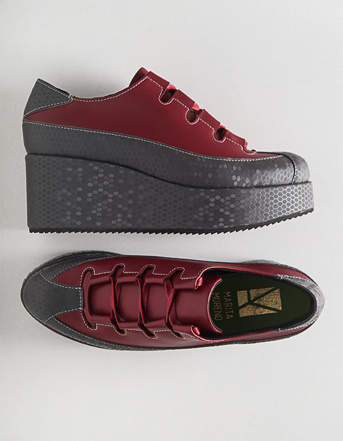StarWars Red & Grey is a very confortable vegan shoe with cork platform, that adjust the foot by red shoelaces. It’s inspired in the 40's shoes - practical shoes in a classic design renewed through the use of platforms. The color palette is based on the dark tones (black, blue and brown) that coordinate with each other as well as mixed with natural and pink colors in a feminine and delicate way. The cork and wood platforms in natural and black tone are a fundamental element and transversal to all the female models - where the main objective is the symbiosis between comfort and elegance.