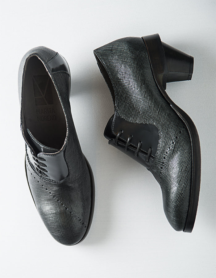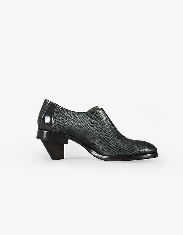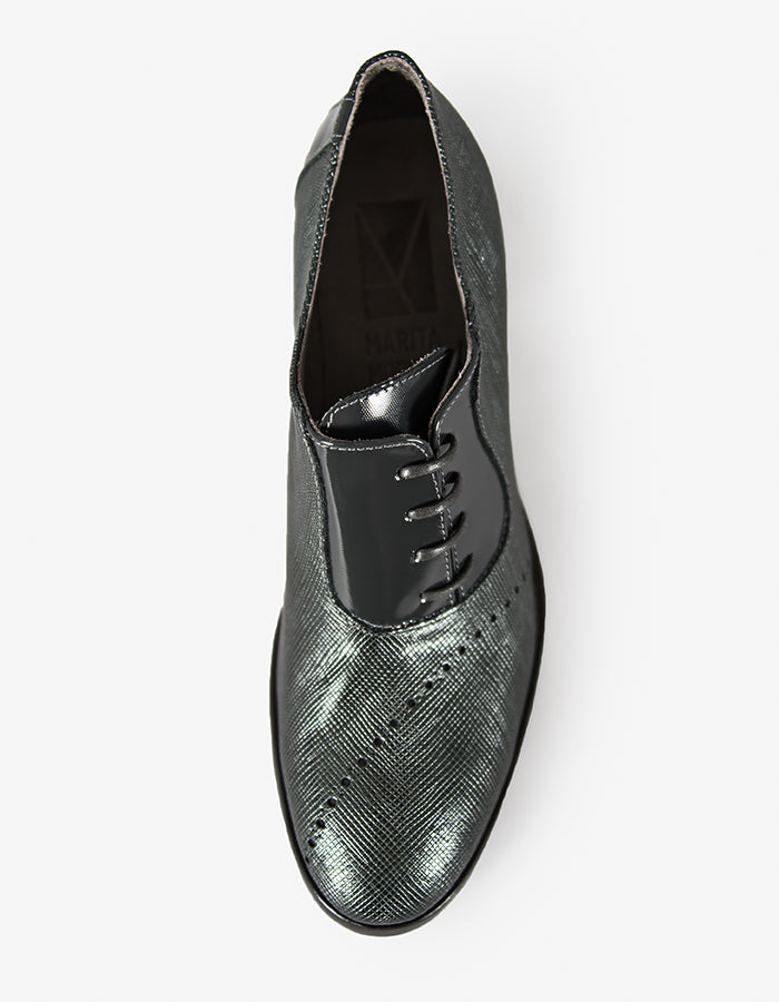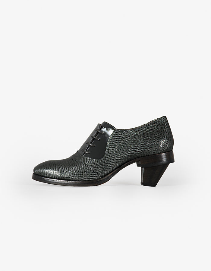 Dali Adelaide Silver é um sapato clássico de altura média de atacadores laterais e com um salto surrealista em que dois saltos aprecem colados numa peça. Este modelo tem um único corte da gáspea do sapato, com perfurações frontais assimétricas que simulam o corte da biqueira e o encaixe lateral para atacadores. São feitos em couro upcycling texturado cor de chumbo e verniz cinza, atacadores cinza e sola de couro clássica, salto de aglomerado e borracha antiderrapante. Perfeito para jeans e fatos, têm um andar muito confortável e atacadores laterais cinzas para ajustar o pé.